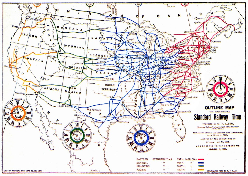 The proposal that was eventually adopted by the railroads is largely credited to William F. Allen, the leader of a prominent railroad trade association. In his proposal, the rigorous fifteen-degree time zone wedges are skewed and morphed to incorporate the major terminus stations of the railroad. White elaborates: The meridians indexing these zones were not of overriding interest to the practical-minded members of the GTC, however. In defining the zones, what railway managers valued highly was a system that minimized their switching costs—that is, a plan that altered existing time division breaks between railways as little as possible. Drawing upon existing railway maps, Allen proposed a system that fit the new zone boundaries to the termini of the railways. The Eastern and Central zones, for example, met at Pittsburgh, where the Pennsylvania Railroad’s two divisions had long switched from "Philadelphia time" to "Columbus time." Allen’s plan was designed so that no railroad would have to reprint schedules or change running times. Most would simply have to reset their clocks and watches a few minutes.