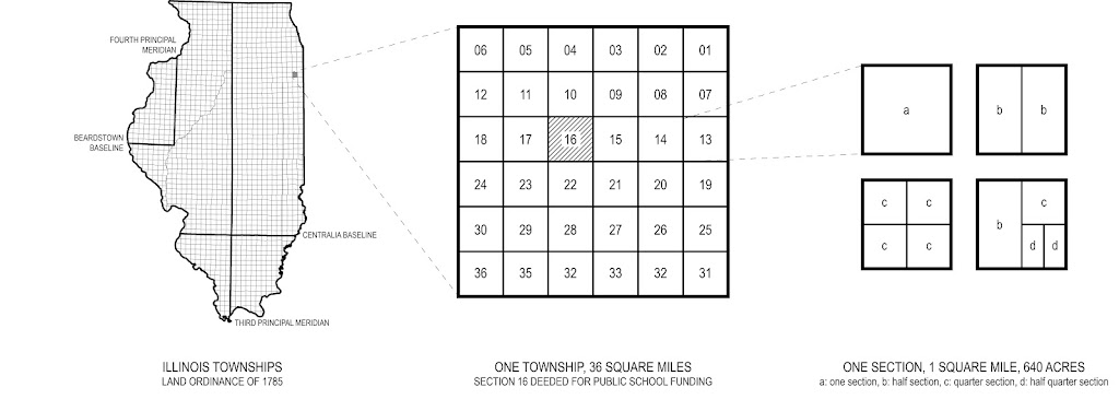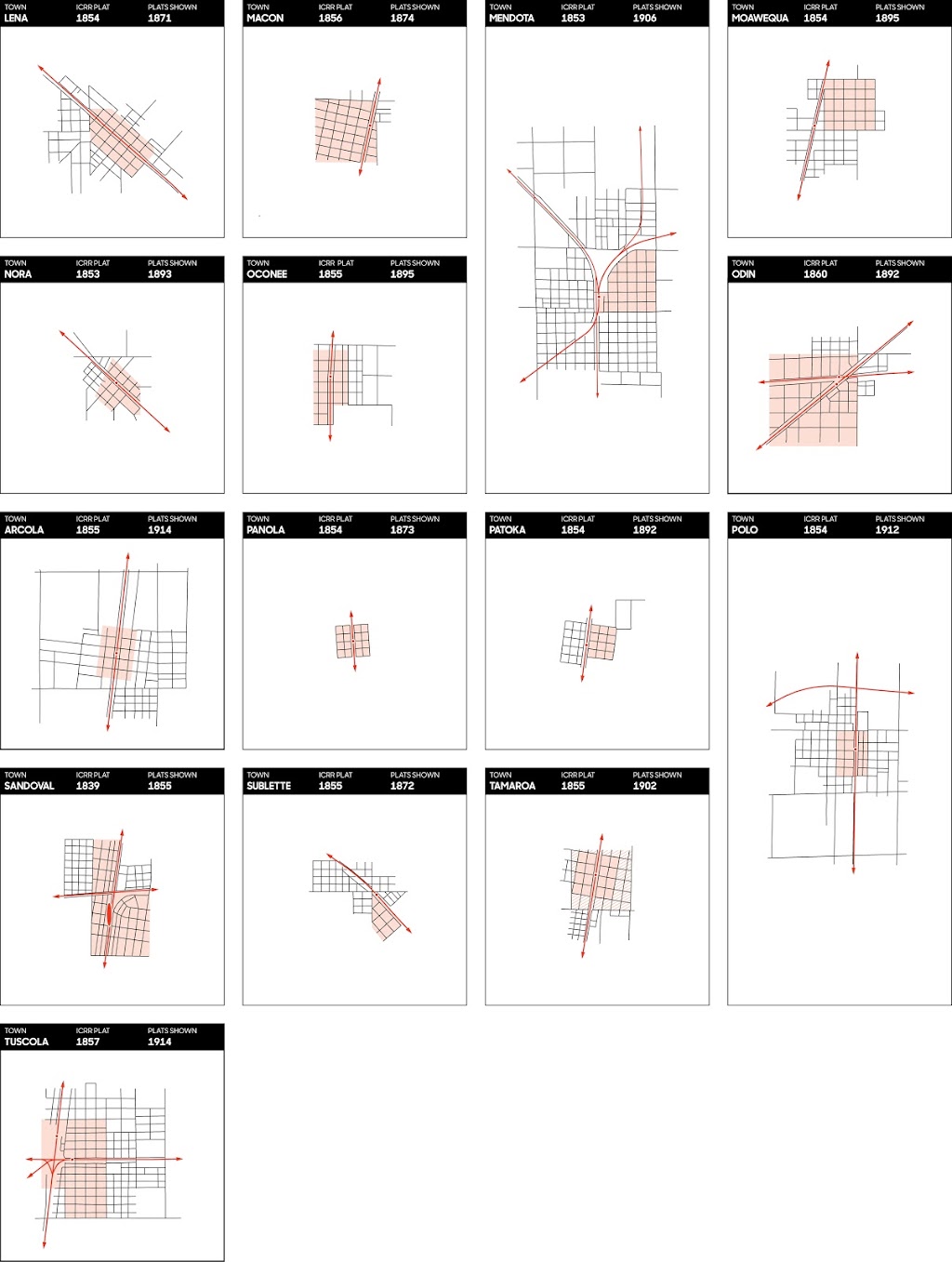 In the early 1800s Illinois’ urban form drew inspiration from many sources. A river would almost always inspire long, narrow parcels at its edge, giving each owner direct access to the waters edge for shipping. Topographical conditions would require consideration, such as a shift in the urban fabric or a road that followed the contours of the countryside. The organization of land into townships and sections distributed ownership into shapes like rectangles and squares that were aligned with the cardinal directions. As such, the most efficient layouts were grids organized along the same axes, though the size and proportion of the streets and blocks varied widely from town to town. Importantly, many were laid out around a shared, central public space: a square or plaza or park that would host gatherings, markets, and festivals. Towns were created by aggregation, platted by anyone who owned the land according to his vision of American urbanism. This tended to produce city forms that, although familiar in their overall organization, remained nuanced and idiosyncratic—a manifestation of the local imaginary.