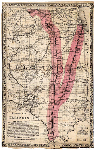 To prevent the railroad from profiting too deeply on the land, an amendment to the act forbade the chartered company to lay out towns on their own sections of land, as town sites would bring a much higher selling price than agricultural land. This stipulation was later rescinded in 1855, to the extent that the ICRR could plat towns at “such points on the (line) where their depots are already located and established.” (There is some evidence that the railroad did, in fact, lay out towns before this date—they simply waited to register the plats with the county until it was legal to do so.) Still, the initial existence of the restriction on laying out towns paved the way for four of the original directors of the ICRR to turn a profit outside of the company itself. David Neal, George Griswold, Jonathan Sturges, and Morris Ketchum, together with R. B. Mason, the engineer in charge of construction, formed a company called the “Land Associates” to purchase key odd-numbered sections of land from the federal government. Because the men had advance knowledge of the final route through Illinois, and influence over the location of depots and stations on odd-numbered sections, they stood to make a great deal of money from the sale of parcels in the new towns. This form of unscrupulous land grab is a constant threat to large public works, especially when they are developed and operated by private consortiums.